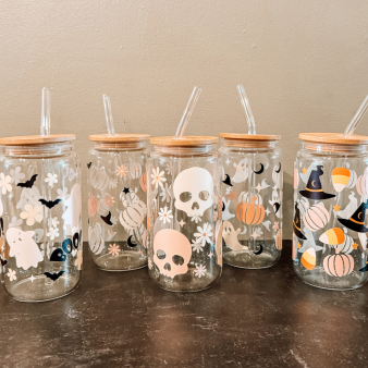 Sip spooky in style! Our Halloween glass tumbler comes with a reusable straw and bamboo lid, making it as eco-friendly as it is festive. Featuring adorable ghost designs — from pumpkin-loving fall spirits to cowboy ghosts strumming guitars — this tumbler is the perfect mix of playful and practical.