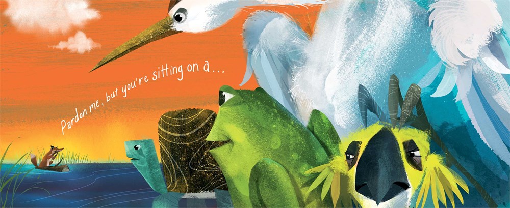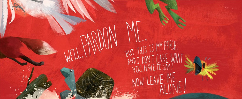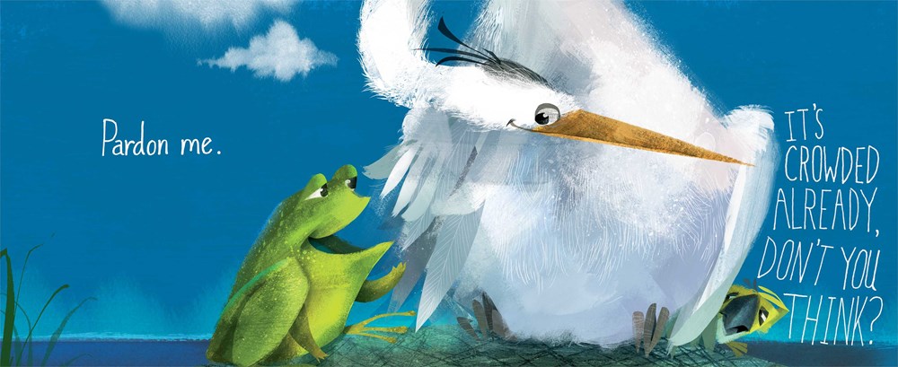 It’s a beautiful, sunny day in the swamp when a little yellow bird settles down on a rock—only to be interrupted as first a heron, then a frog, then a turtle ask to sit on the rock with him. As each animal says “pardon me,” the little bird’s replies get grumpier: