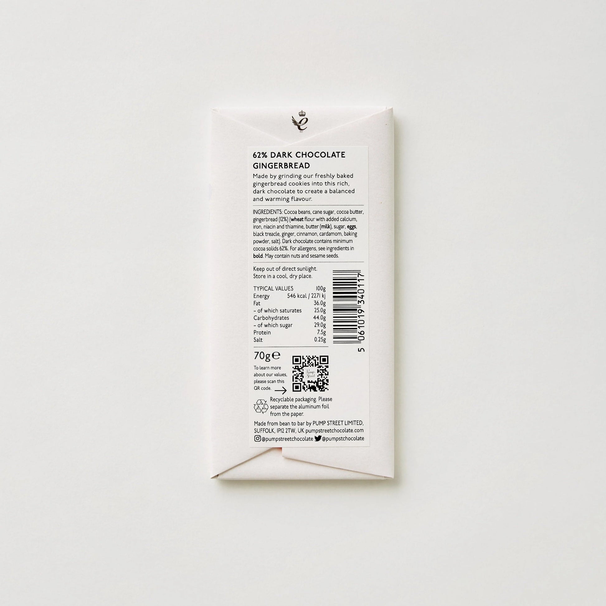 Our Gingerbread bar is made with our freshly baked gingerbread cookies, one of our seasonal staples. Spiced not just with ginger but cinnamon and cardamom too, when combined with West Papua cocoa they produce a chocolate with a rich and deep seasonal flavour and a lasting toasty finish.